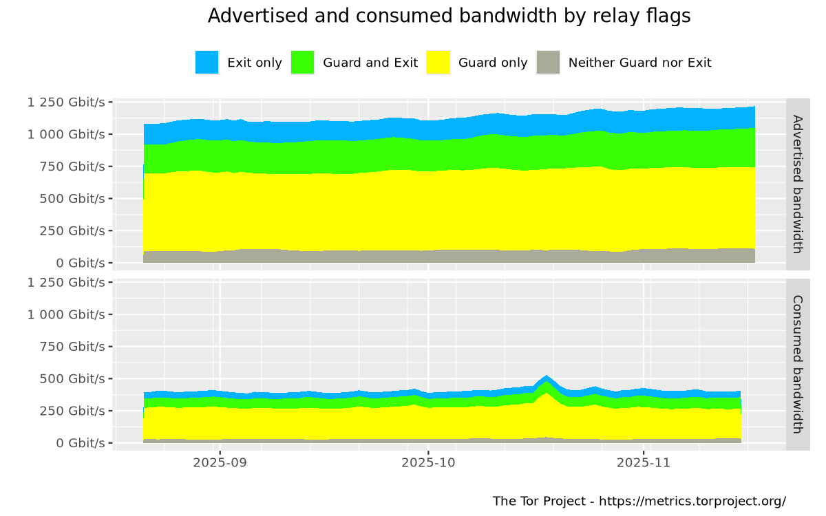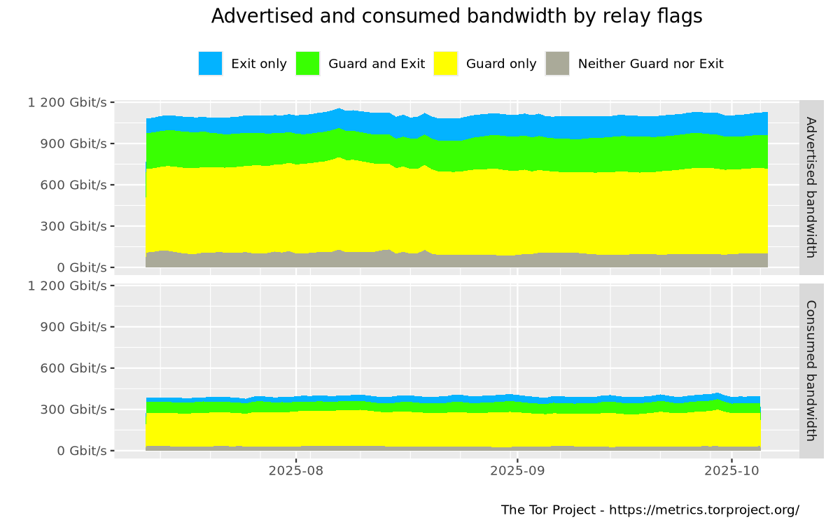 This graph shows advertised and consumed bandwidth of relays with "Exit" and/or "Guard" flags assigned by the directory authorities.
