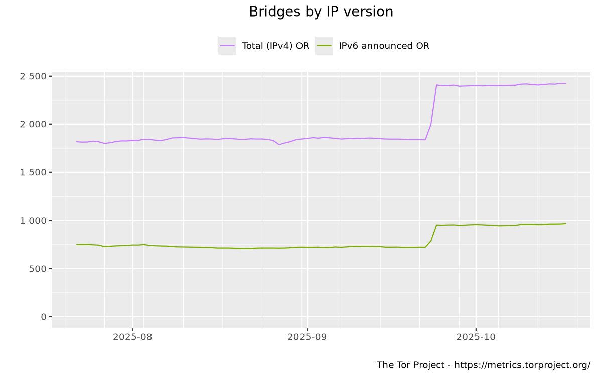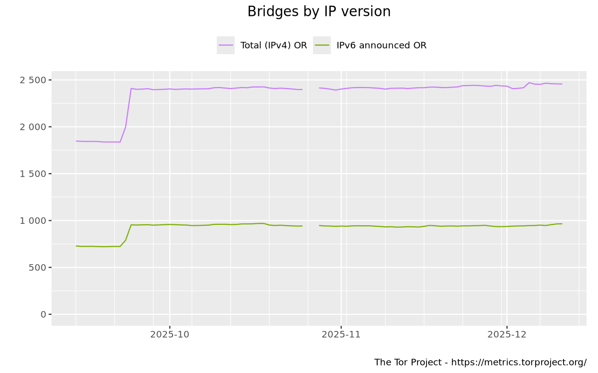 This graph shows the number of bridges supporting IPv6 as compared to all bridges. A bridge can support IPv6 by announcing an IPv6 address and port for the OR protocol.