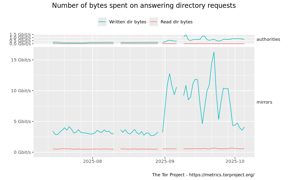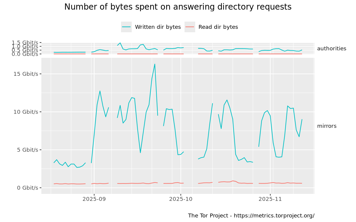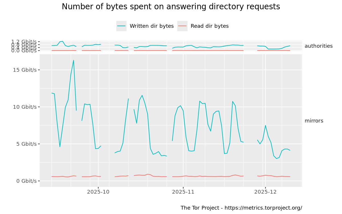 This graph shows the portion of consumed bandwidth that directory authorities and directory mirrors have spent on answering directory requests.