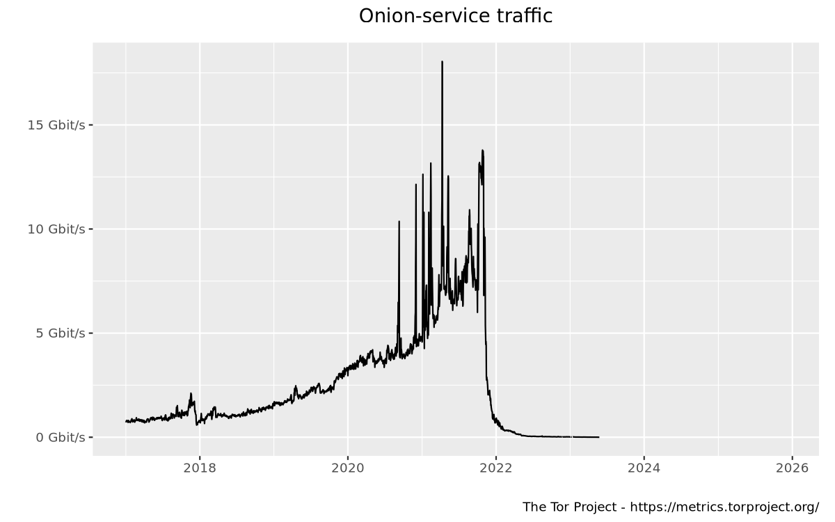 This graph shows the amount of onion-service traffic from version 2 onion services relayed by rendezvous points. This number is extrapolated from aggregated statistics on onion-service traffic reported by single relays acting as rendezvous points for version 2 onion services, if at least 1% of relays reported these statistics. For more details on the extrapolation algorithm, see this blog post and this technical report.