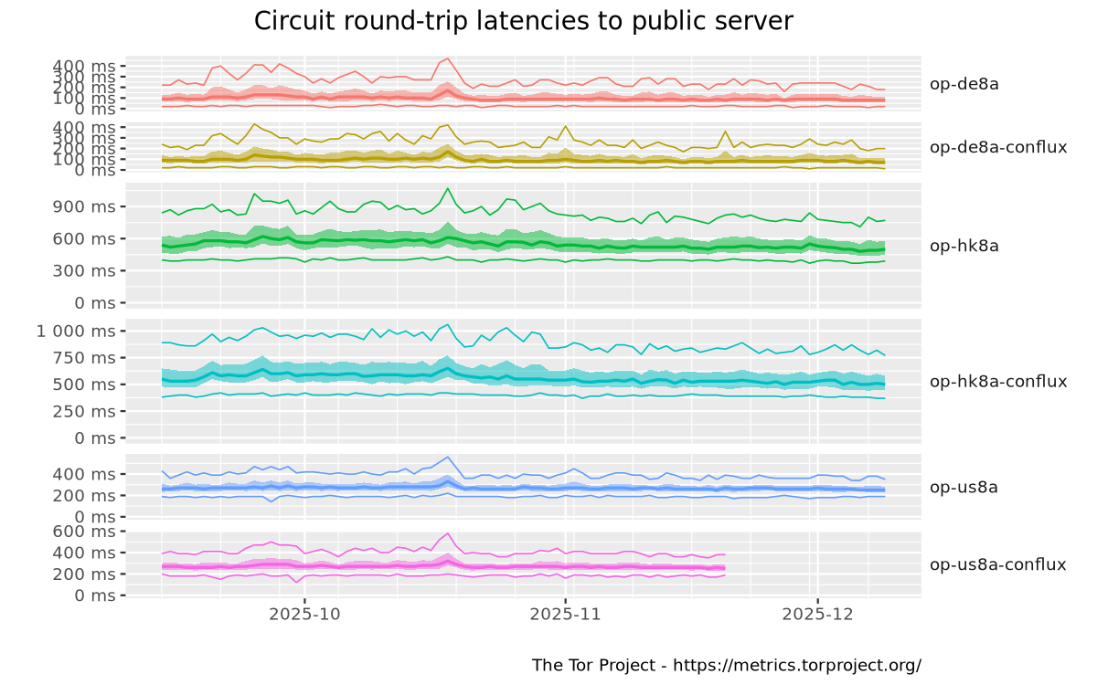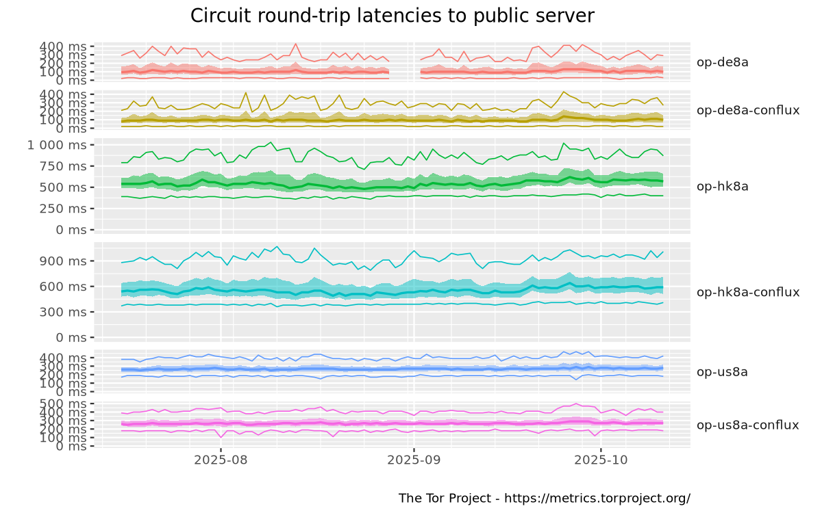 This graph shows round-trip latencies of circuits used for downloading static files of different sizes over Tor, either from a server on the public internet or from an onion server. Round-trip latencies are measured as the time between sending the HTTP request and receiving the HTTP response header. The graph shows the median of measurements as thick line, the range of measurements from first to third quartile as ribbon, and the highest and lowest non-outlier measurements as thin lines.
