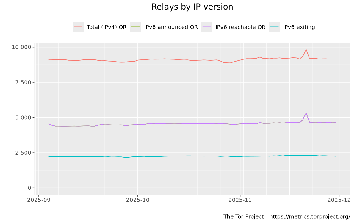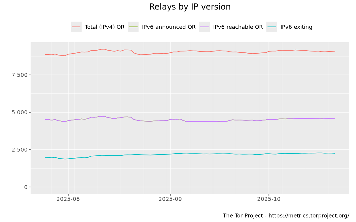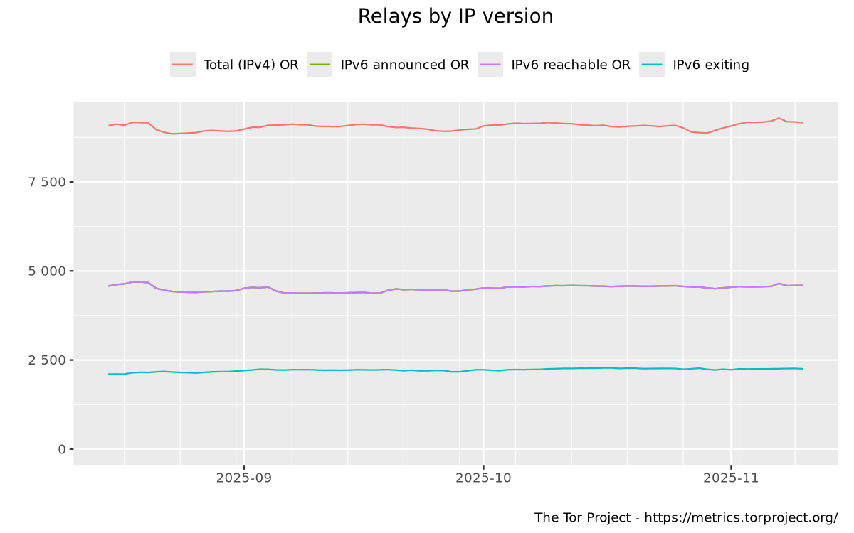 This graph shows the number of relays supporting IPv6 as compared to all relays. A relay can support IPv6 by announcing an IPv6 address and port for the OR protocol, which may then be confirmed as reachable by the directory authorities, and by permitting exiting to IPv6 targets. These sets are not distinct, because relays can have various combinations of announced/confirmed OR ports and exit policies.