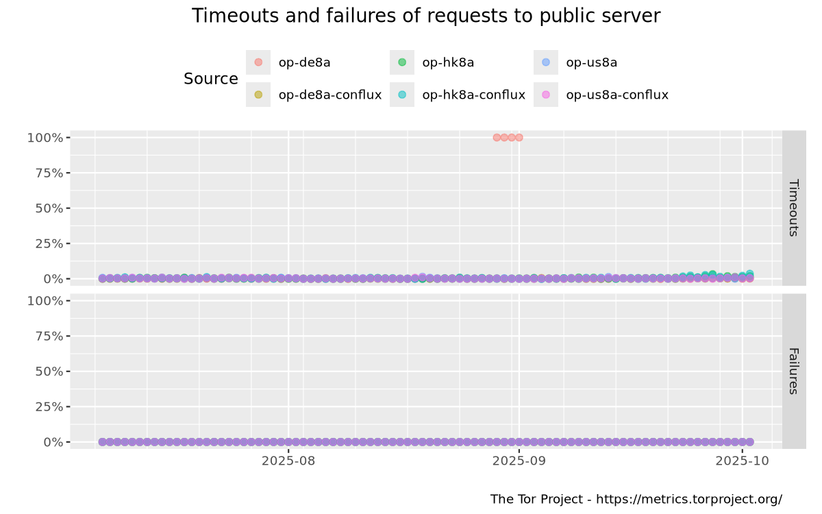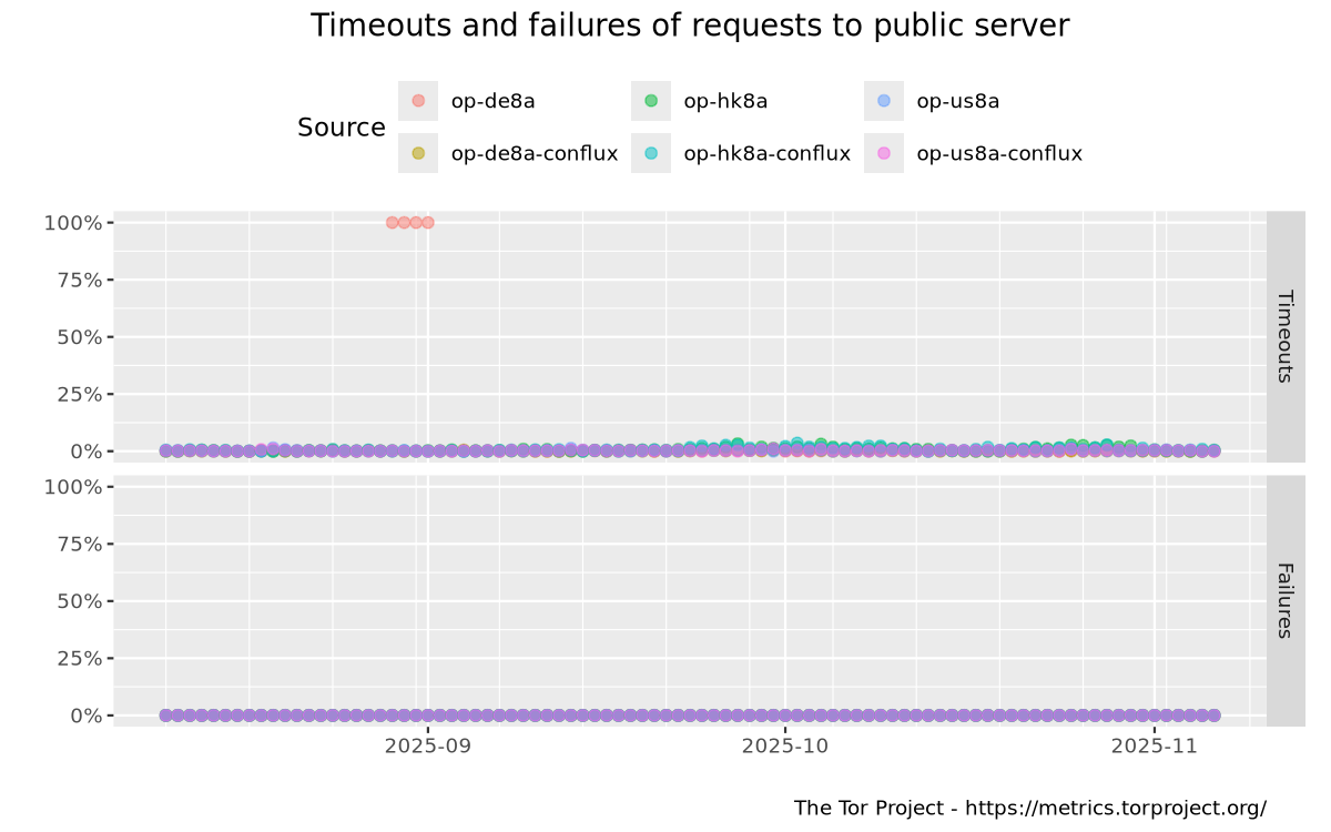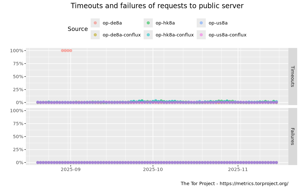 This graph shows the fraction of timeouts and failures when downloading static files of different sizes over Tor, either from a server on the public internet or from an onion server. A timeout occurs when a download does not complete within the scheduled time, in which case it is aborted in order not to overlap with the next scheduled download. A failure occurs when the download completes, but the response is smaller than expected.