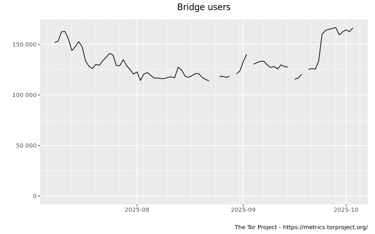 This graph shows the estimated number of clients connecting via bridges. These numbers are derived from directory requests counted on bridges. Bridges resolve client IP addresses of incoming directory requests to country codes, and they distinguish connecting clients by transport protocol, which may include pluggable transports. Even though bridges don't report a combination of clients by country and transport, it's possible to derive and graph lower and upper bounds from existing usage statistics. For further details check the documentation on Reproducible Metrics.