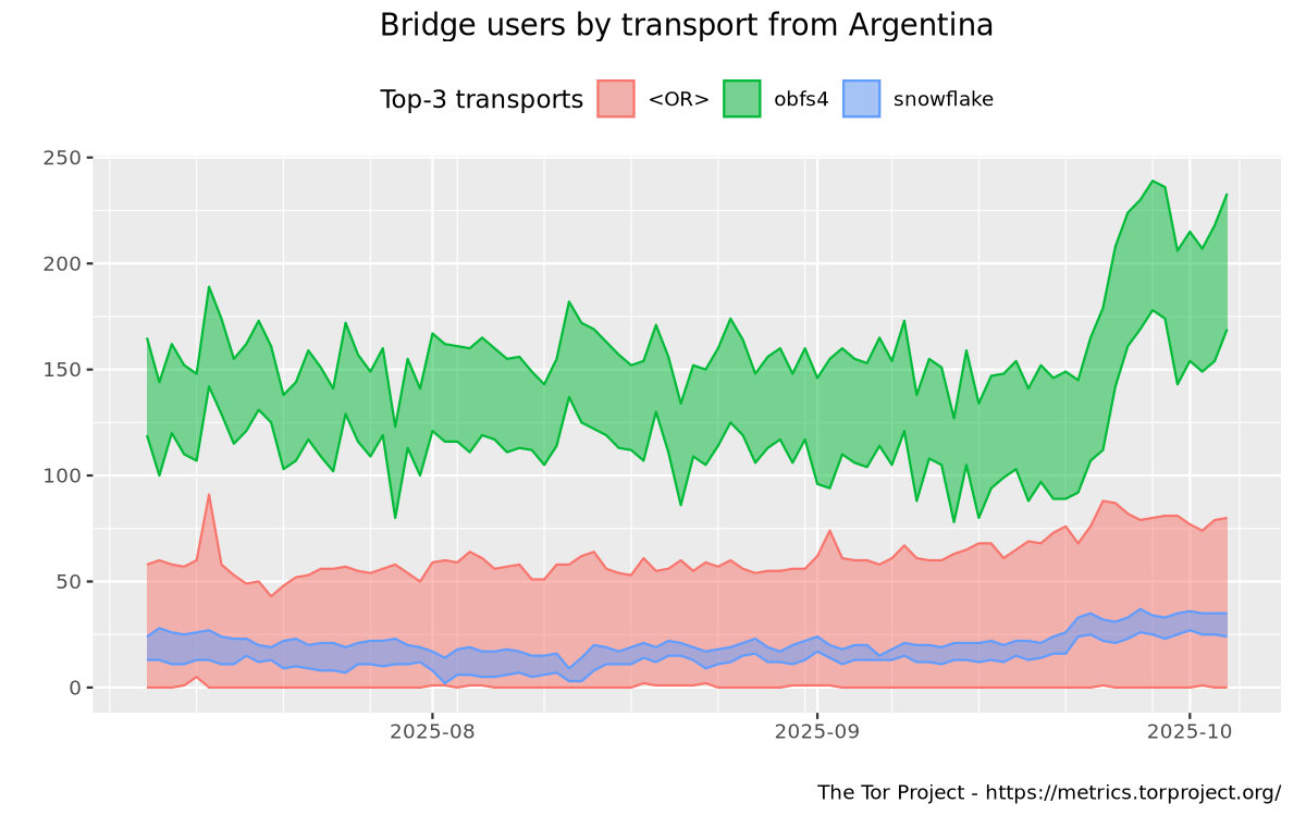 This graph shows the estimated number of clients connecting via bridges. These numbers are derived from directory requests counted on bridges. Bridges resolve client IP addresses of incoming directory requests to country codes, and they distinguish connecting clients by transport protocol, which may include pluggable transports. Even though bridges don't report a combination of clients by country and transport, it's possible to derive and graph lower and upper bounds from existing usage statistics. For further details check the documentation on Reproducible Metrics.