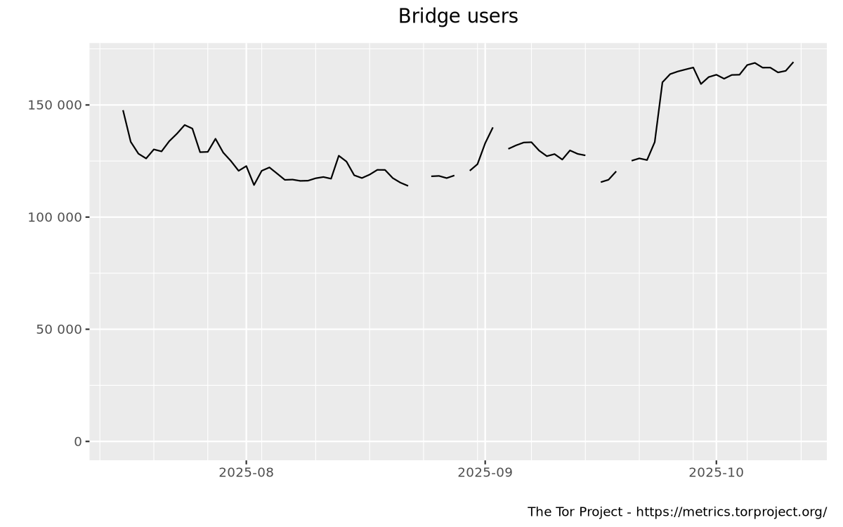 This graph shows the estimated number of clients connecting via bridges. These numbers are derived from directory requests counted on bridges. Bridges resolve client IP addresses of incoming directory requests to country codes, and they distinguish connecting clients by transport protocol, which may include pluggable transports. Even though bridges don't report a combination of clients by country and transport, it's possible to derive and graph lower and upper bounds from existing usage statistics. For further details check the documentation on Reproducible Metrics.