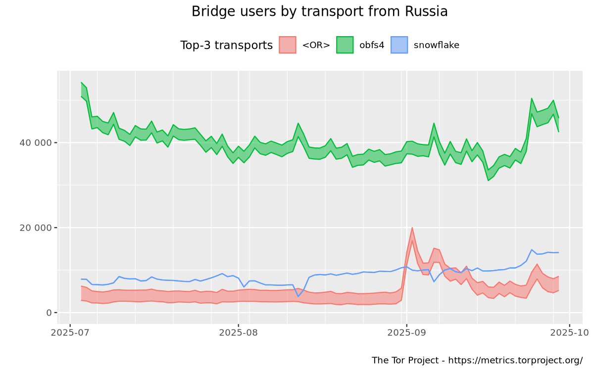 This graph shows the estimated number of clients connecting via bridges. These numbers are derived from directory requests counted on bridges. Bridges resolve client IP addresses of incoming directory requests to country codes, and they distinguish connecting clients by transport protocol, which may include pluggable transports. Even though bridges don't report a combination of clients by country and transport, it's possible to derive and graph lower and upper bounds from existing usage statistics. For further details check the documentation on Reproducible Metrics.