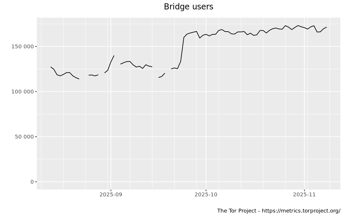This graph shows the estimated number of clients connecting via bridges. These numbers are derived from directory requests counted on bridges. Bridges resolve client IP addresses of incoming directory requests to country codes, so that graphs are available for most countries. For further details check the documentation on Reproducible Metrics.