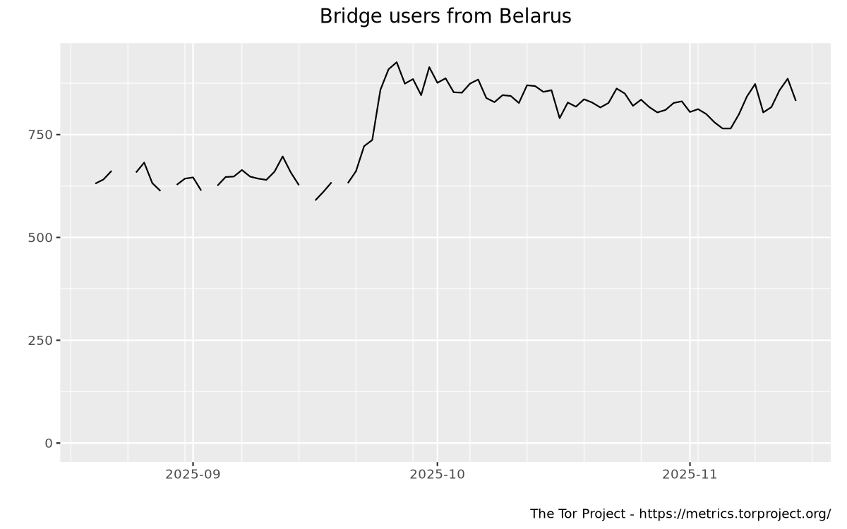 This graph shows the estimated number of clients connecting via bridges. These numbers are derived from directory requests counted on bridges. Bridges resolve client IP addresses of incoming directory requests to country codes, so that graphs are available for most countries. For further details check the documentation on Reproducible Metrics.