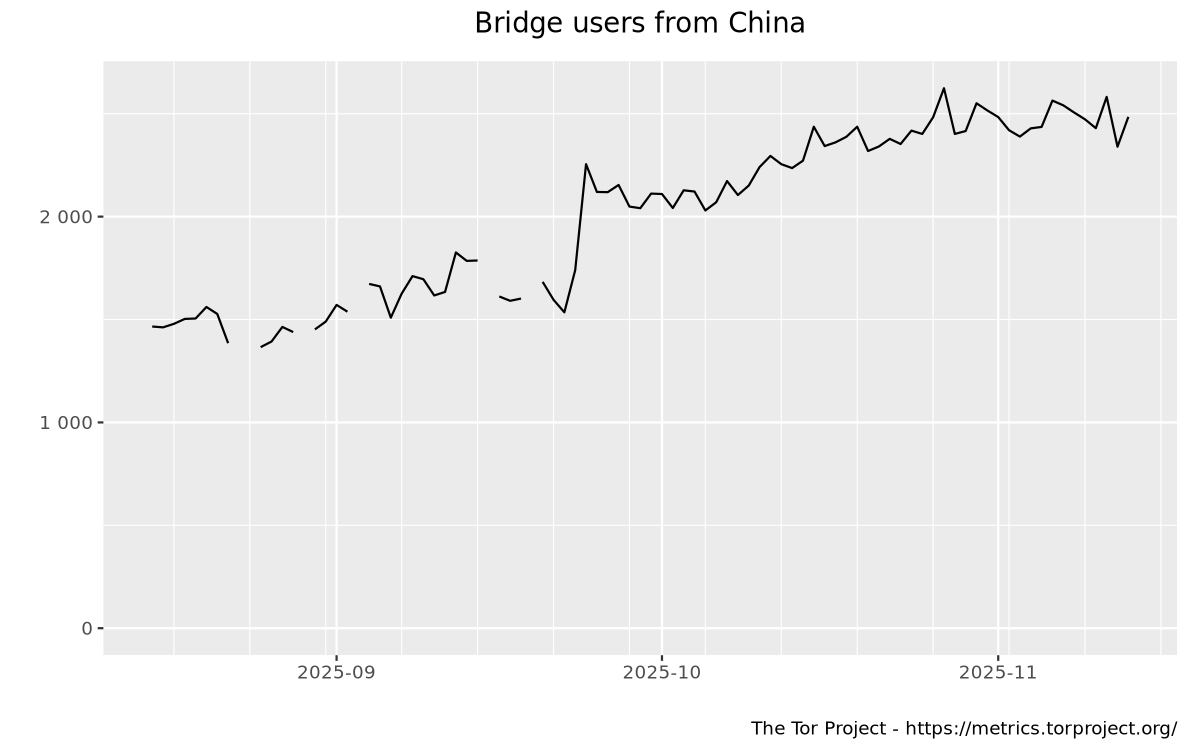 This graph shows the estimated number of clients connecting via bridges. These numbers are derived from directory requests counted on bridges. Bridges resolve client IP addresses of incoming directory requests to country codes, so that graphs are available for most countries. For further details check the documentation on Reproducible Metrics.