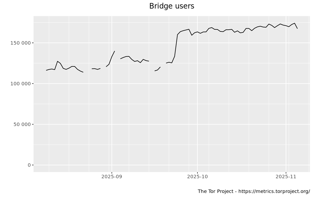 This graph shows the estimated number of clients connecting via bridges. These numbers are derived from directory requests counted on bridges. Bridges resolve client IP addresses of incoming directory requests to country codes, so that graphs are available for most countries. For further details check the documentation on Reproducible Metrics.