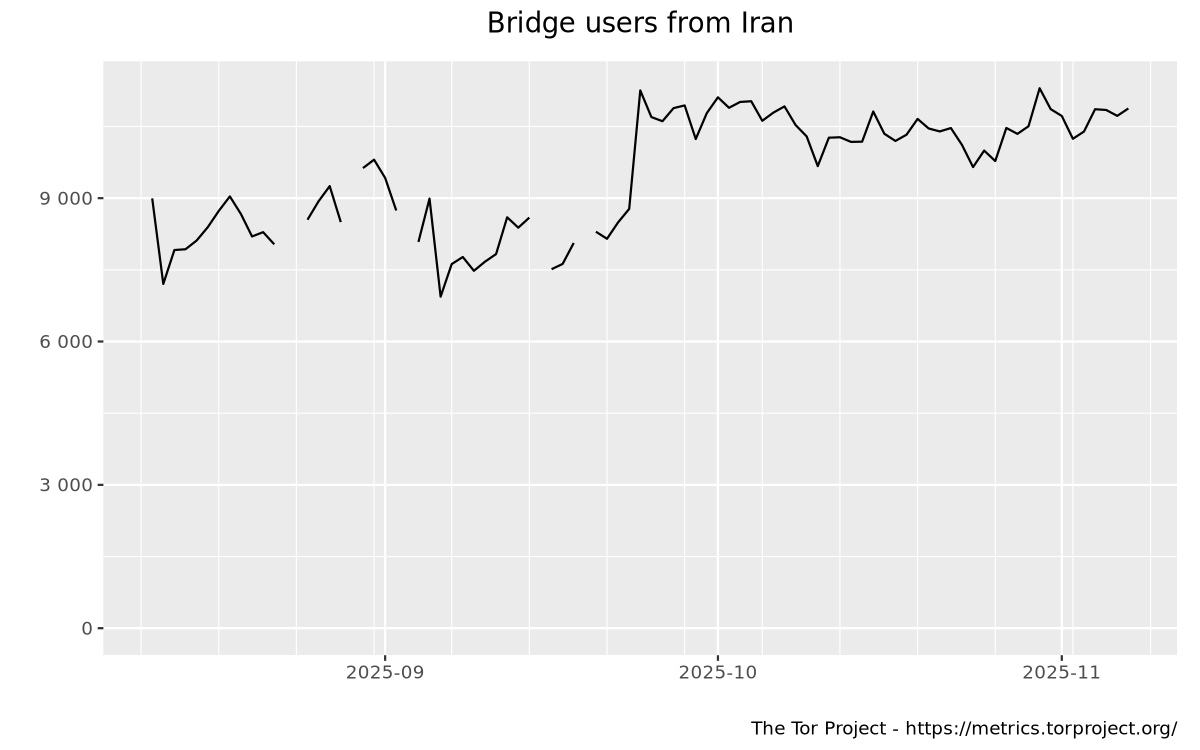 This graph shows the estimated number of clients connecting via bridges. These numbers are derived from directory requests counted on bridges. Bridges resolve client IP addresses of incoming directory requests to country codes, so that graphs are available for most countries. For further details check the documentation on Reproducible Metrics.