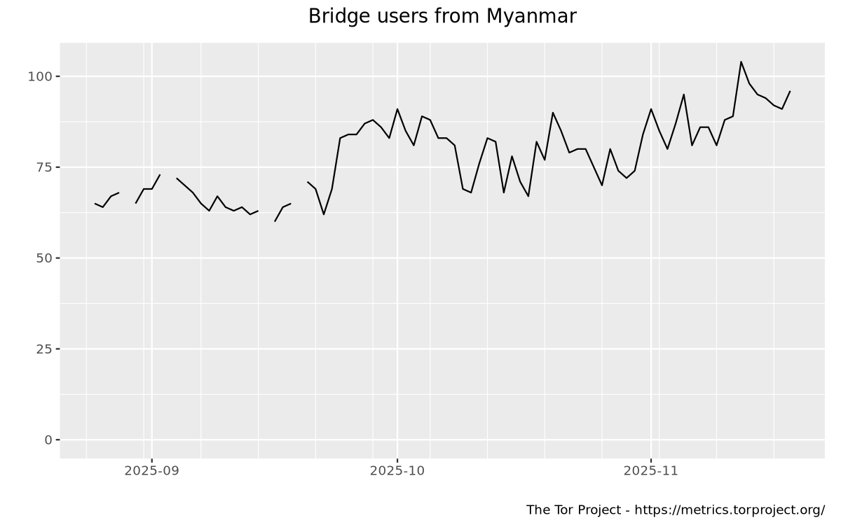This graph shows the estimated number of clients connecting via bridges. These numbers are derived from directory requests counted on bridges. Bridges resolve client IP addresses of incoming directory requests to country codes, so that graphs are available for most countries. For further details check the documentation on Reproducible Metrics.