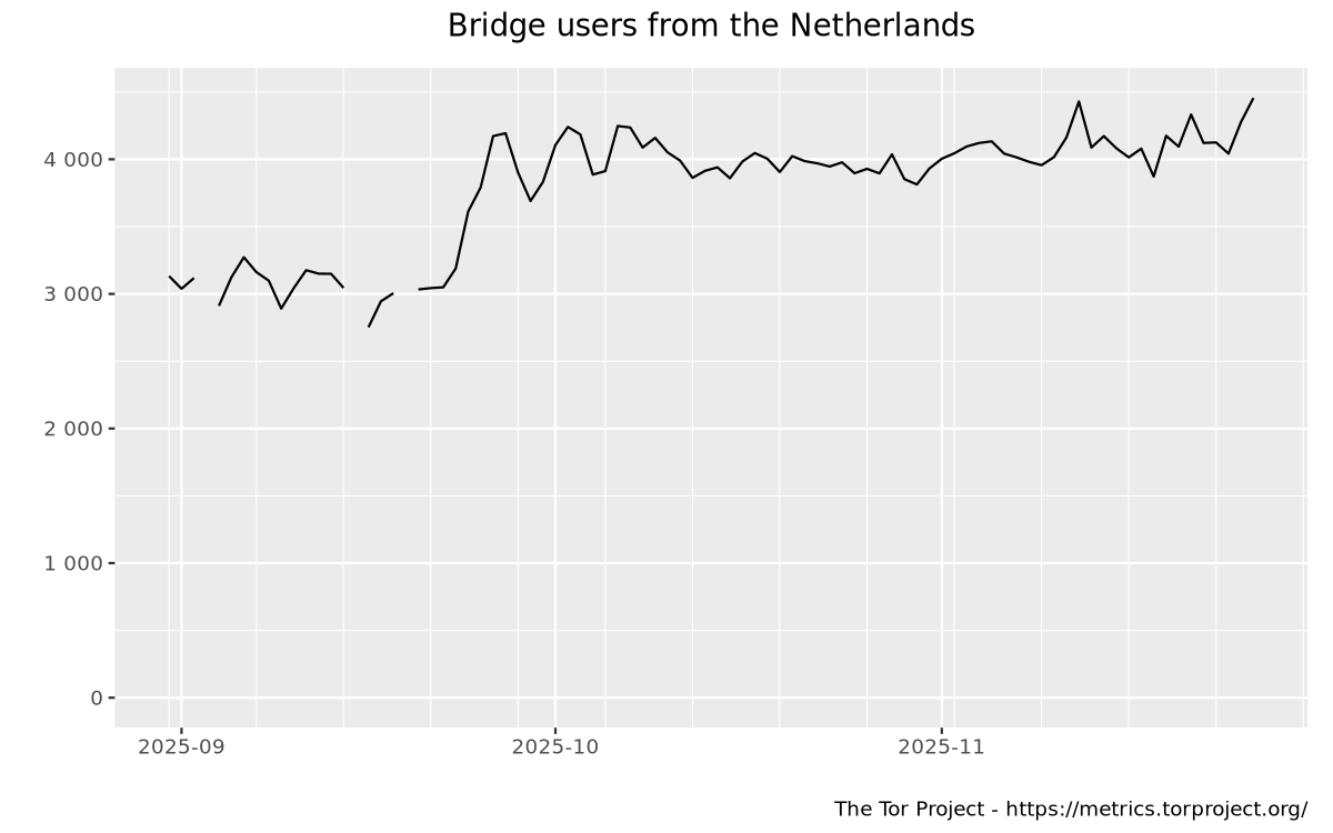 This graph shows the estimated number of clients connecting via bridges. These numbers are derived from directory requests counted on bridges. Bridges resolve client IP addresses of incoming directory requests to country codes, so that graphs are available for most countries. For further details check the documentation on Reproducible Metrics.