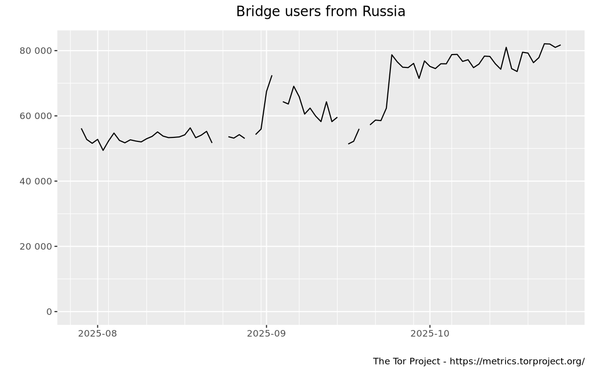 This graph shows the estimated number of clients connecting via bridges. These numbers are derived from directory requests counted on bridges. Bridges resolve client IP addresses of incoming directory requests to country codes, so that graphs are available for most countries. For further details check the documentation on Reproducible Metrics.