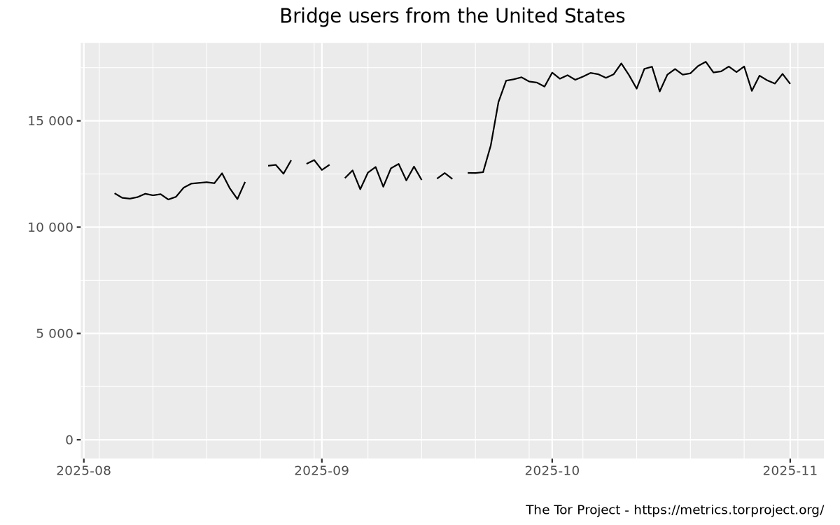 This graph shows the estimated number of clients connecting via bridges. These numbers are derived from directory requests counted on bridges. Bridges resolve client IP addresses of incoming directory requests to country codes, so that graphs are available for most countries. For further details check the documentation on Reproducible Metrics.