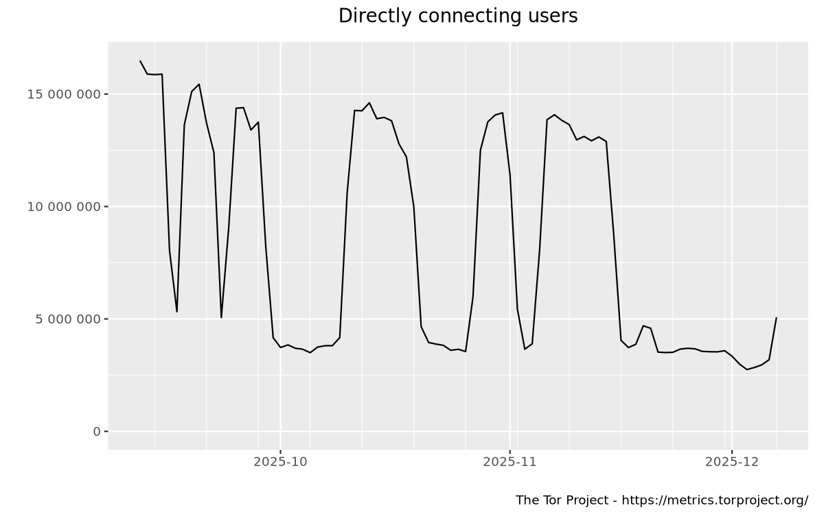 This graph shows the estimated number of directly-connecting clients; that is, it excludes clients connecting via bridges. These estimates are derived from the number of directory requests counted on directory authorities and mirrors. Relays resolve client IP addresses to country codes, so that graphs are available for most countries. Furthermore, it is possible to display indications of censorship events as obtained from an anomaly-based censorship-detection system (for more details, see this technical report). For further details check the documentation on Reproducible Metrics.