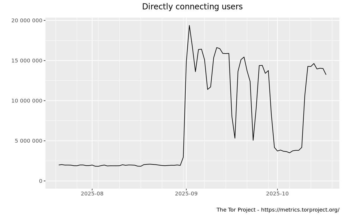 This graph shows the estimated number of directly-connecting clients; that is, it excludes clients connecting via bridges. These estimates are derived from the number of directory requests counted on directory authorities and mirrors. Relays resolve client IP addresses to country codes, so that graphs are available for most countries. Furthermore, it is possible to display indications of censorship events as obtained from an anomaly-based censorship-detection system (for more details, see this technical report). For further details check the documentation on Reproducible Metrics.