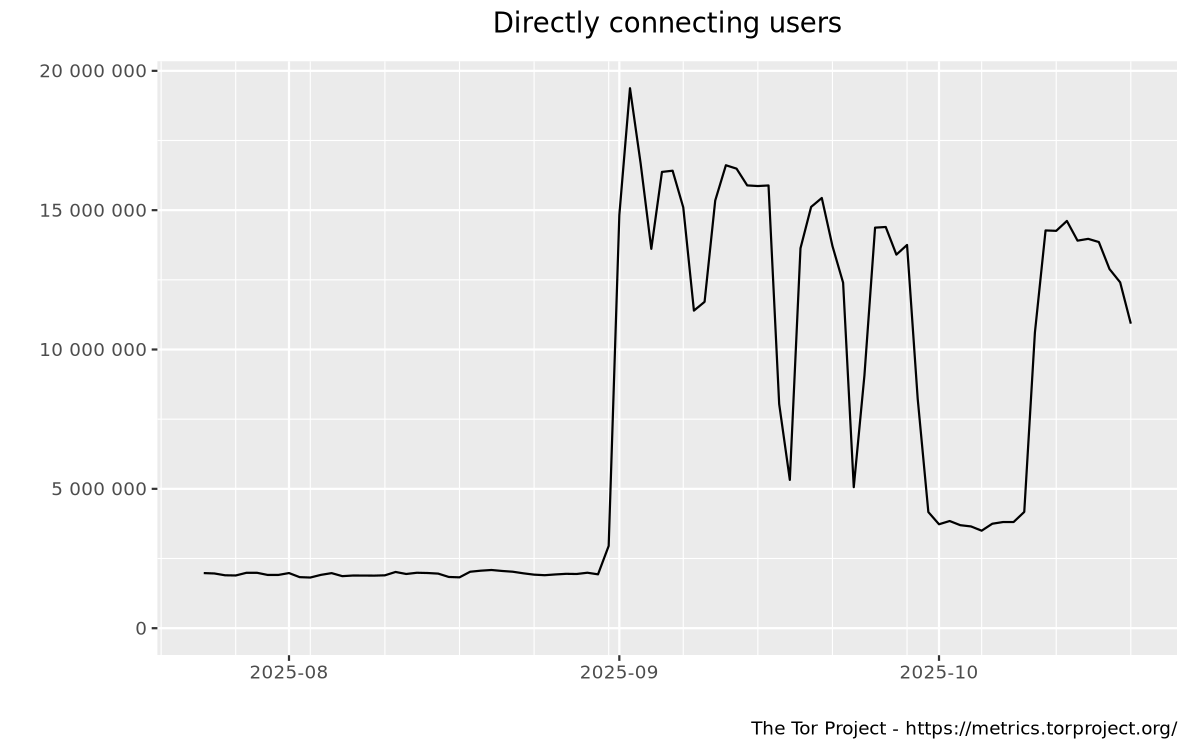 This graph shows the estimated number of directly-connecting clients; that is, it excludes clients connecting via bridges. These estimates are derived from the number of directory requests counted on directory authorities and mirrors. Relays resolve client IP addresses to country codes, so that graphs are available for most countries. Furthermore, it is possible to display indications of censorship events as obtained from an anomaly-based censorship-detection system (for more details, see this technical report). For further details check the documentation on Reproducible Metrics.