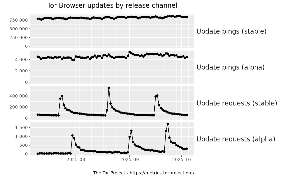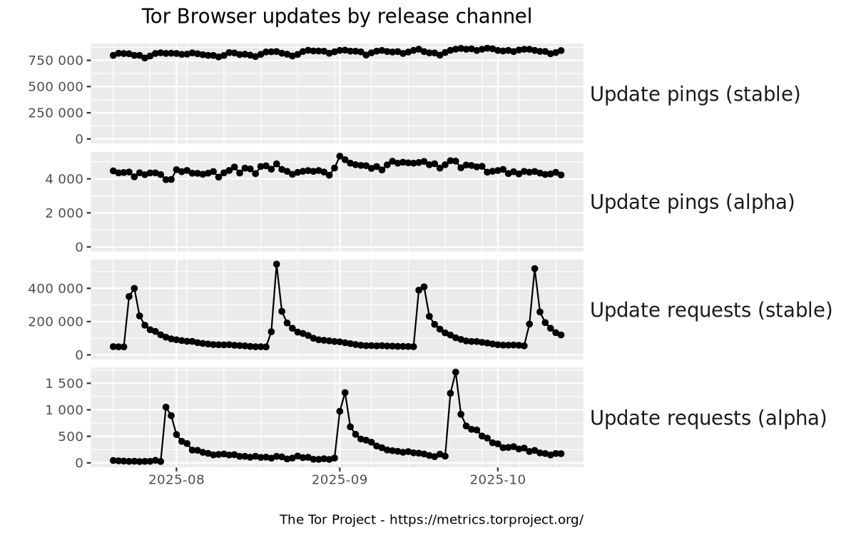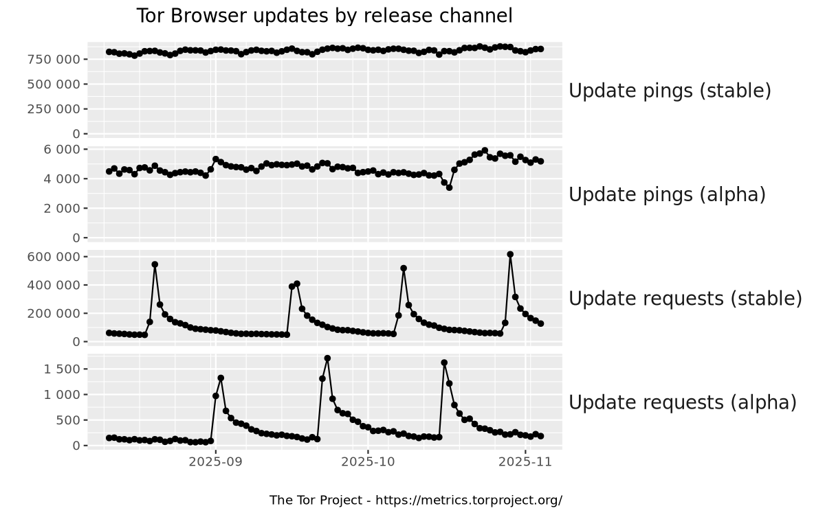 This graph shows absolute numbers of requests to Tor's web servers made by Tor Browser to check whether a newer version is available or to download a newer version, broken down by release channel.