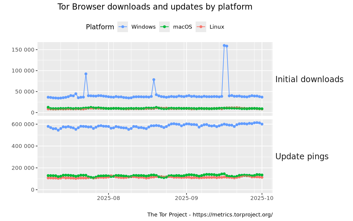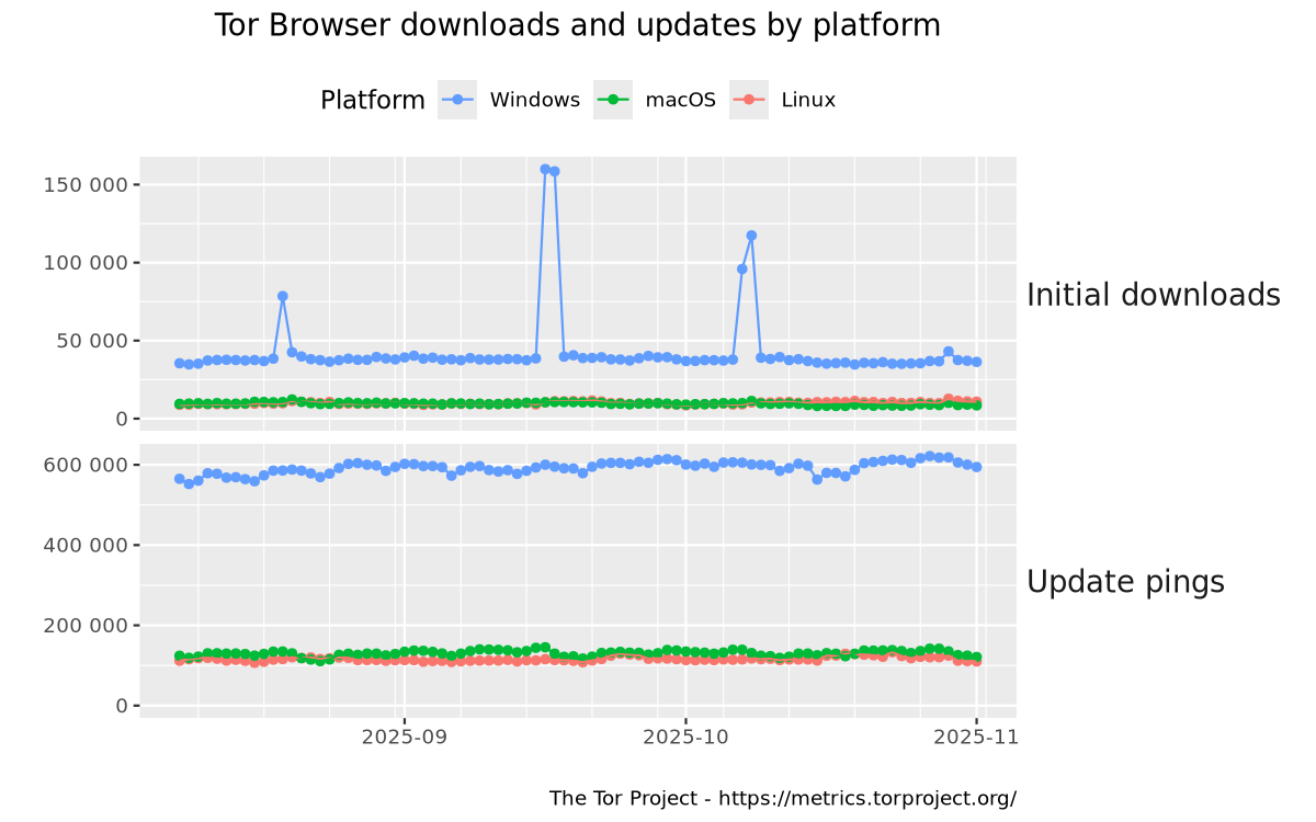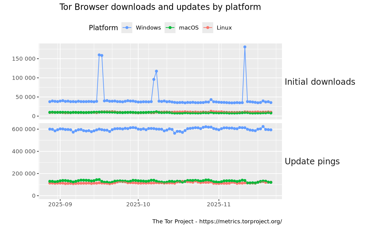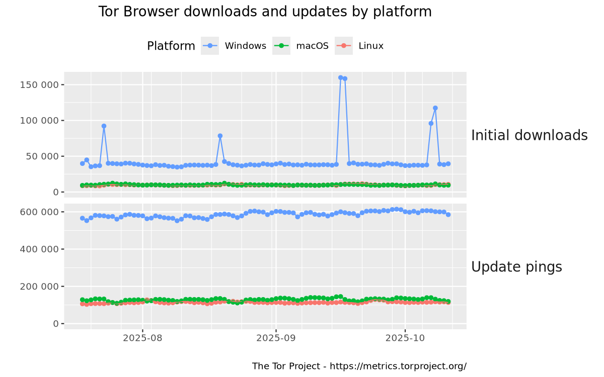 This graph shows absolute numbers of requests to Tor's web servers to download a Tor Browser executable and requests made by Tor Browser to check for an update, broken down by platform (Windows, macOS, Linux). Note that, at least for initial downloads, this graph does not show the platform used to download Tor Browser but the platform that it was downloaded for.