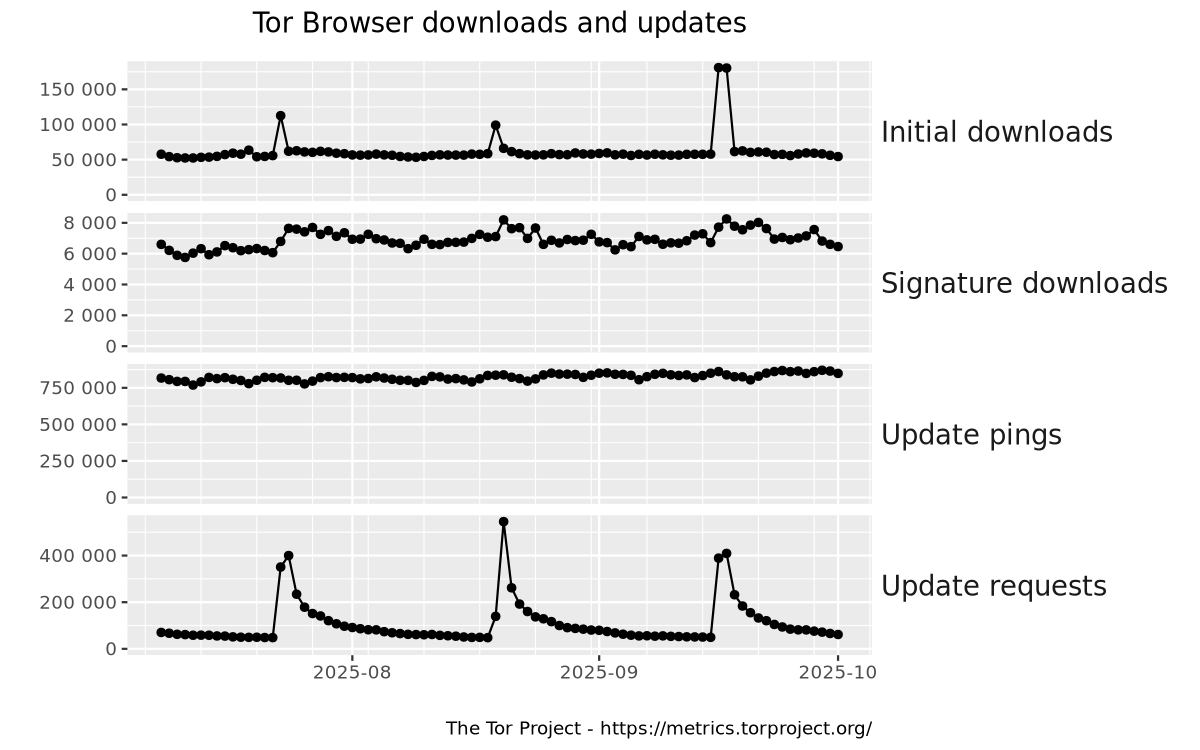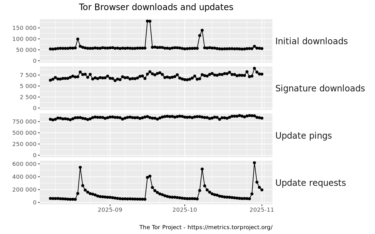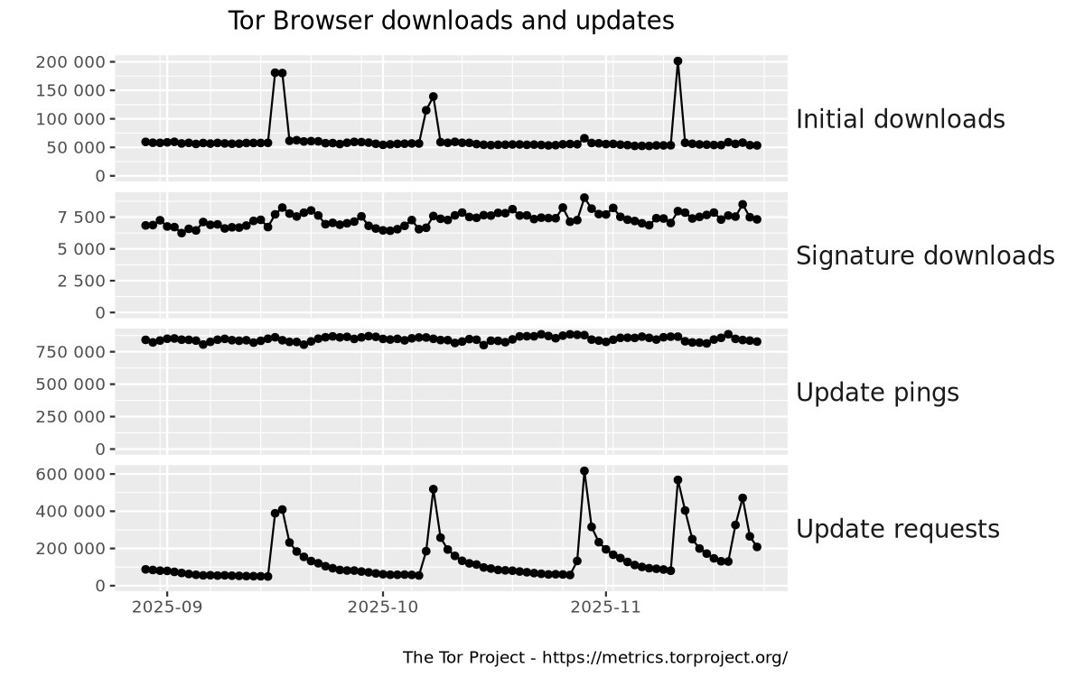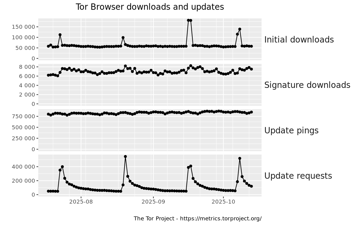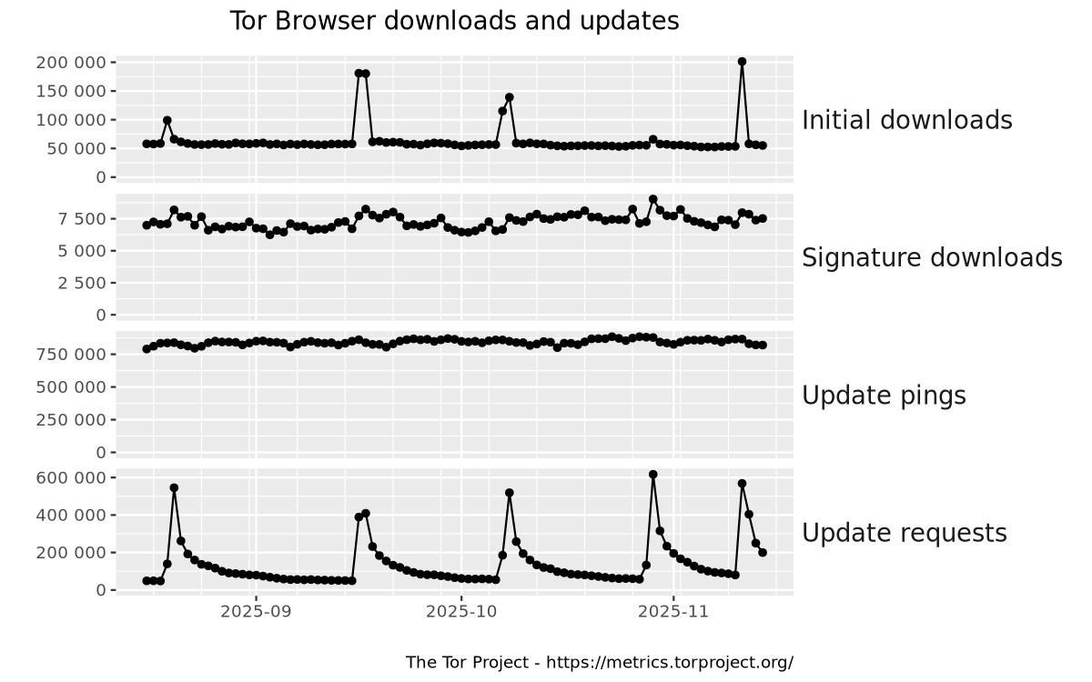This graph shows absolute numbers of requests to Tor's web servers related to Tor Browser. Initial downloads and signature downloads are requests made by the user to download a Tor Browser executable or a corresponding signature file from the Tor website. Update pings and update requests are requests made by Tor Browser to check whether a newer version is available or to download a newer version.
